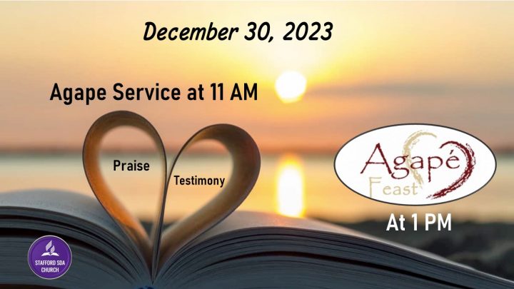 Join us this Sabbath, December 30, 2023 for our year-end AGAPE Service, which begins at 11 AM. It is a special service where our members and attendees are invited to give praise and testimonies of the goodness of God to them in 2023 and together sing hymns of praise and thanks.